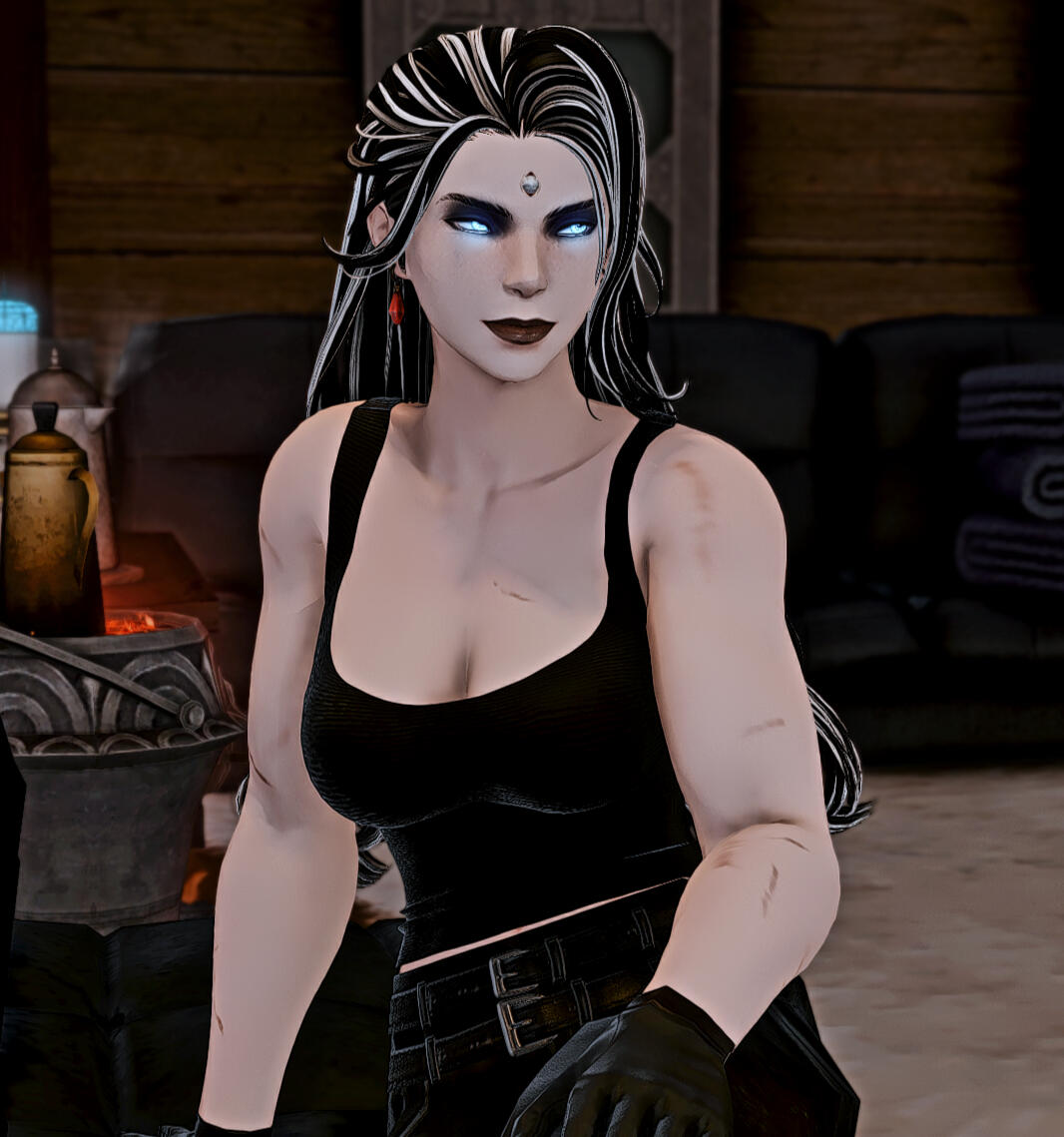 ☑️She has a distant look to her very eerie jet black gaze. She's... been through quite a bit. You could be curious about her story!